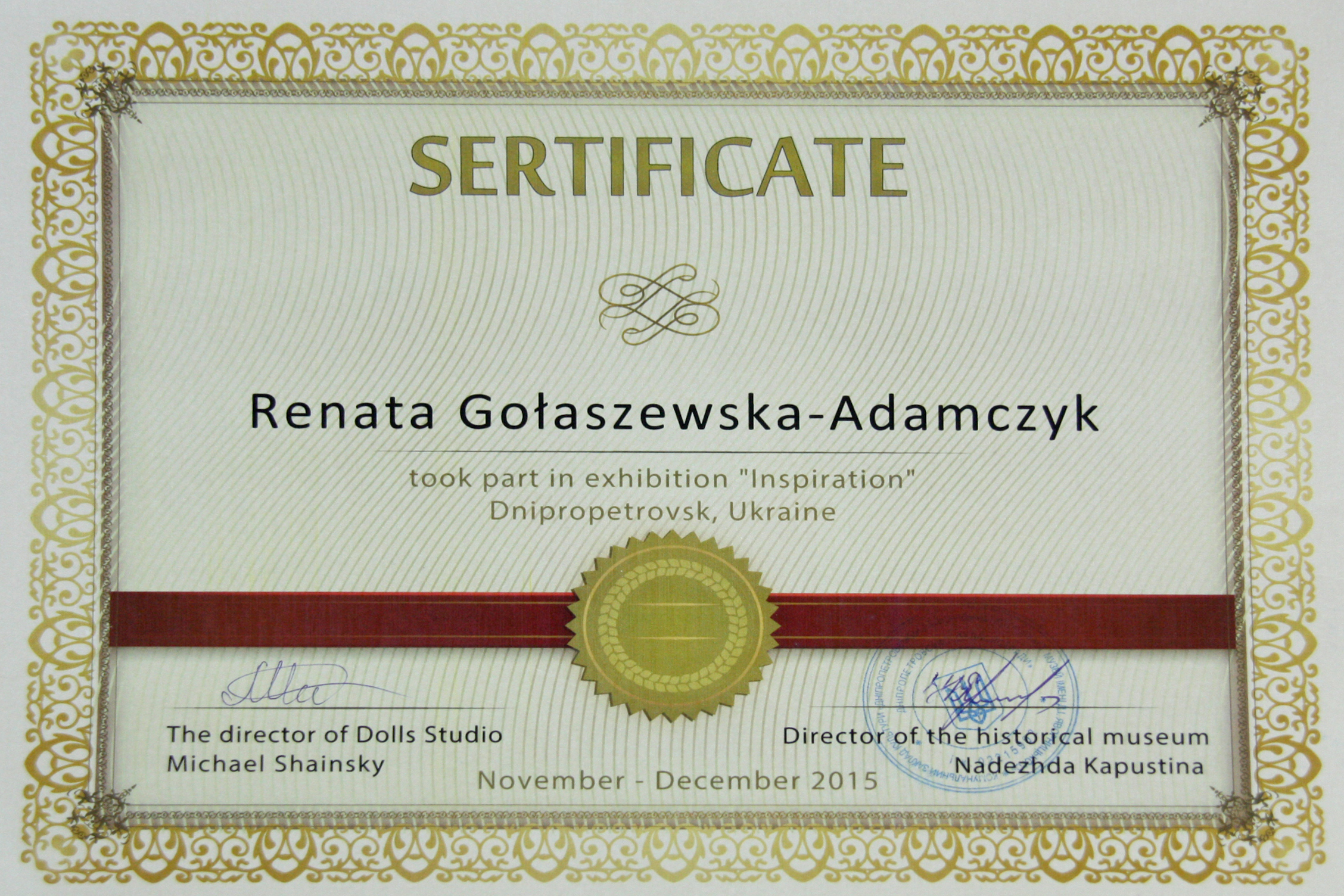 DYPLOMY I NAGRODYDofinansowanie z fundacji Susan Oroyan możliwości wyjazdu na konferencję NIADA Dyplom za zajęcie I-go miejsca Doll Prague 2015 / Czechy, kategoria – lalka z tkaniny Dniepropietrowsk – Muzeum Historyczne Wystawa listopad – grudzień 2015 Udział w wystawie międzynarodowej w Kijowie (16-18 października 2015) DYPLOMY I NAGRODYsobota, 1 kwietnia, 2017admin